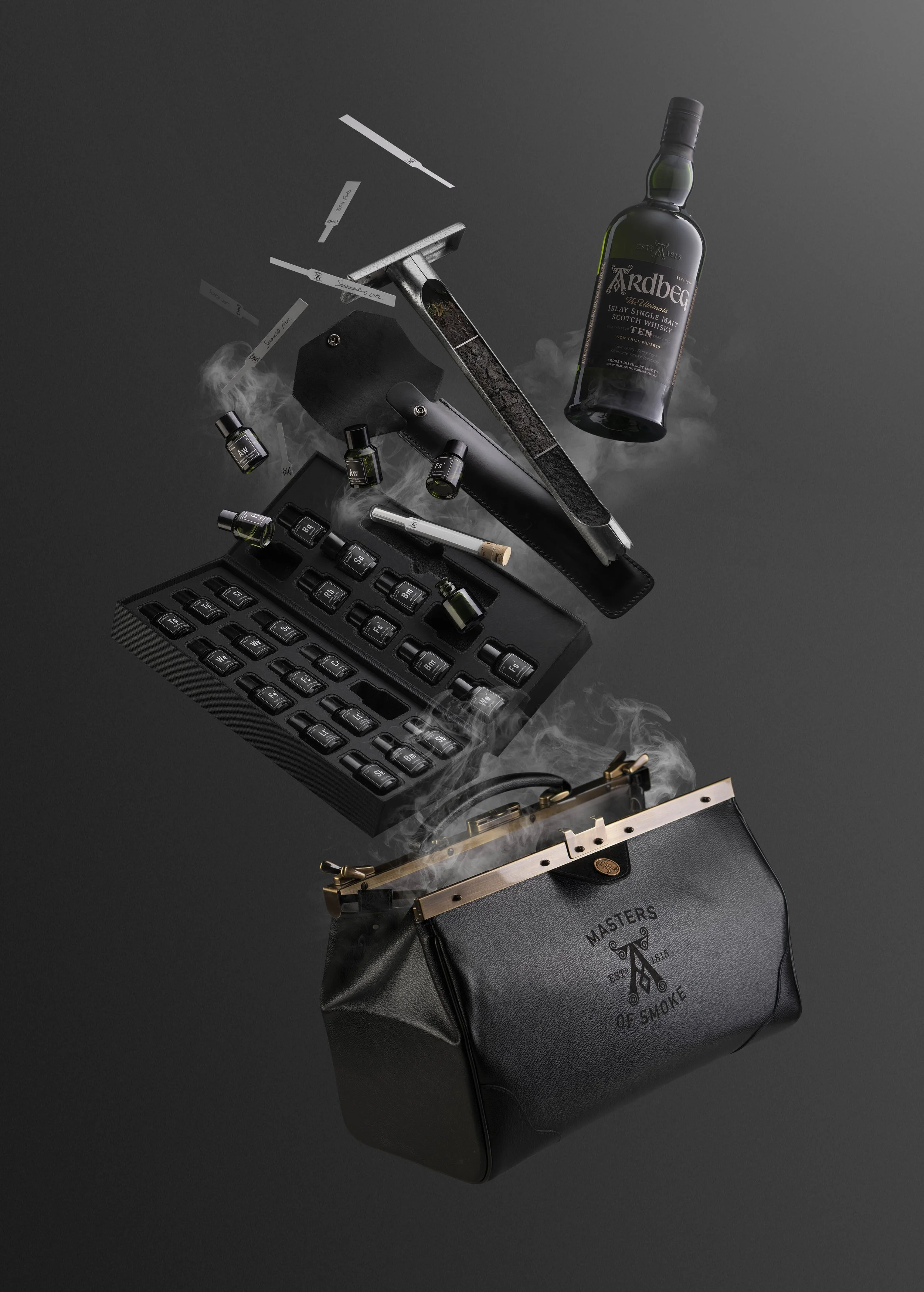 Masters of Smoke was an educational programme designed to communicate Ardbeg’s signature smoky character while also revealing the deeper layers of flavour beyond the smoke. Central to the programme was the “peatyodic” table; a playful nod to the science of smoke, designed to map and communicate the full spectrum of flavours across the Ardbeg range.